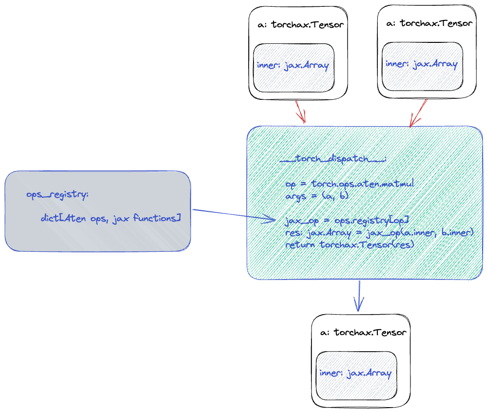 How torchax works is by having a torch front end; so that each torch operator eventually becomes JAX functions acting on JAX arrays. Therefore,